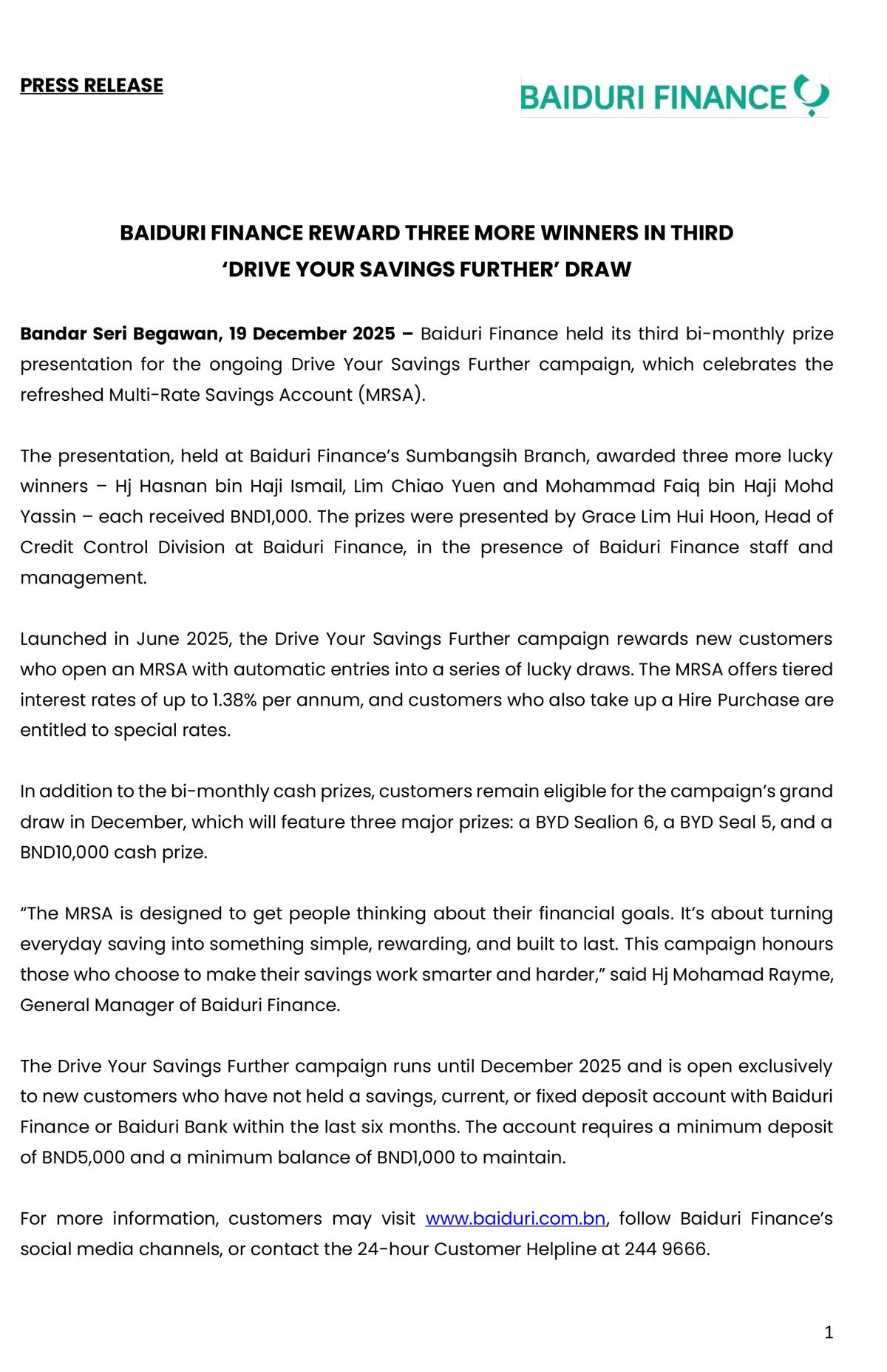 BBB 19 Dec 2025 – BAIDURI FINANCE REWARD THIRD DRIVE YOUR SAVINGS FURTHER WINNERS